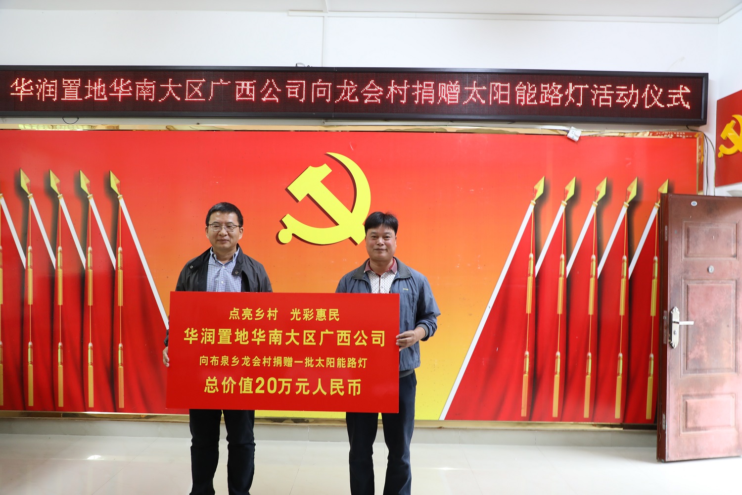 (華潤置地華南大區(qū)廣西公司黨總支部書記、副總經(jīng)理朱沫(左)代表公司向龍會(huì)村捐贈(zèng)。右為龍會(huì)村村支書、村委主任李斌)